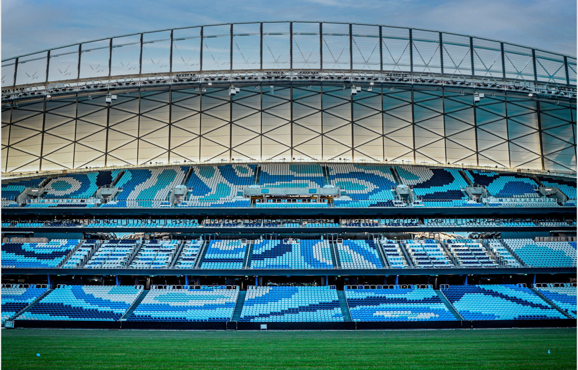 “Each end of the stadium is separated and distinguished by two different designs symbolising land and water – the land through geometric lines taken from nature, and the bubble of concentric circles for water,” Mr Albert said.