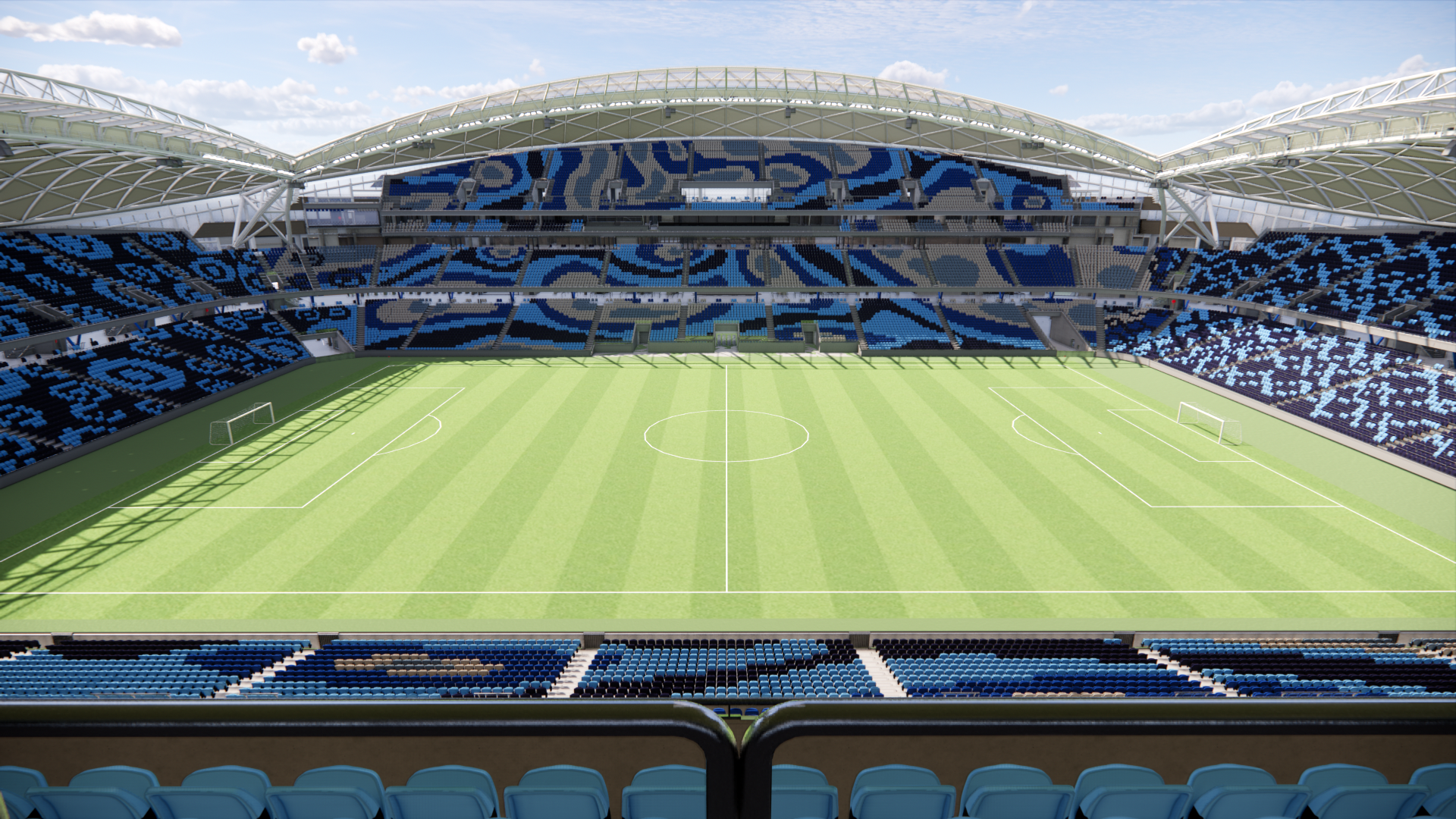 Award-winning Indigenous artist Tony Albert was commissioned to create a design which covers all 42,500 seats of the new stadium. The theme of the design is “Two Worlds Colliding – Water and Land”, with abstract designs featuring topographical views of Sydney, and whale and goanna totems.