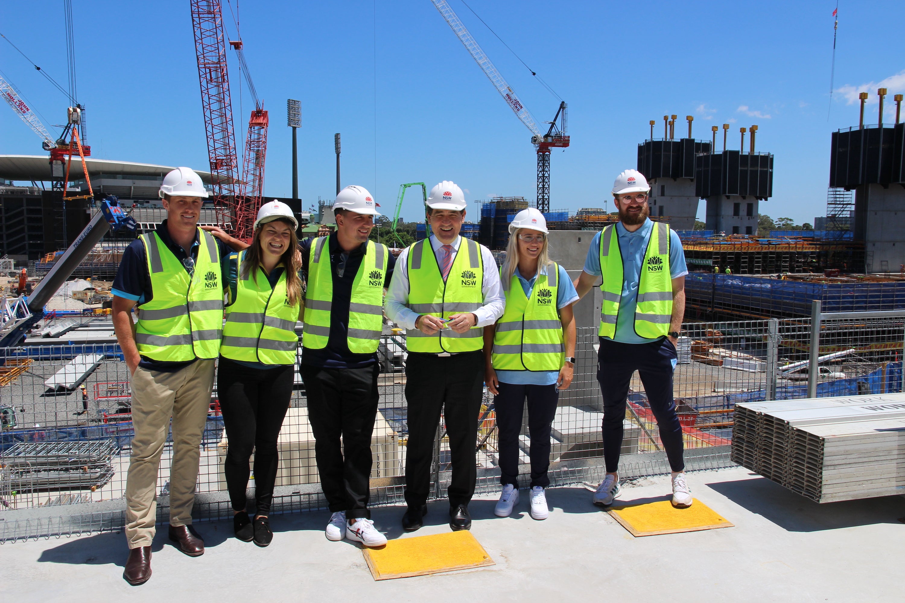 Andrew Redmayne and Remy Seimsen of Sydney FC, Victor Radley of the Sydney Roosters, Grace Hamilton of the Wallaroos and Alex Newsome from the NSW Waratahs, joined the Acting Minister for Sport Geoff Lee on site to mark the milestone and see the progress at their home ground.