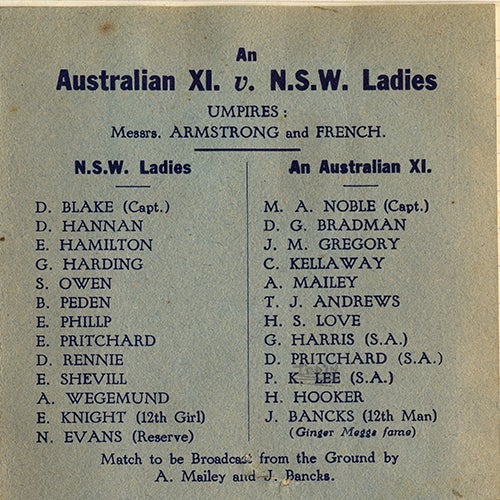 Legendary cricketer Donald Bradman played in the world’s first day-night cricket match at the Sydney Sports Ground on 8 November 1930. The match was a novelty game raising funds for the City Girls’ Amateur Sports Association. The male cricket team, including Bradman, Monty Noble, Jack Gregory and cartoonist Jim Bancks, competed against a team of amateur female cricketers.